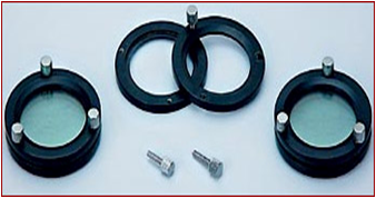 Newton Ring Apparatus having two black Powder Coated aluminum ring’s and fitted with set of two Crown Glass extra White lenses of one plain glass and one spherical plano Convex lens of Focal Length of 200 & 100 cm with three adjustable screws to produce Newton Ring’s when applying the pressure. Each apparatus packed in Velvet Box.